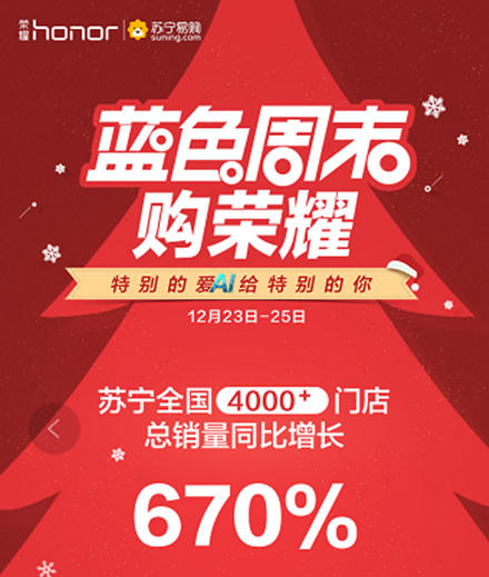 榮耀手機成最熱聖誕禮物 蘇寧門店總銷量大增670%