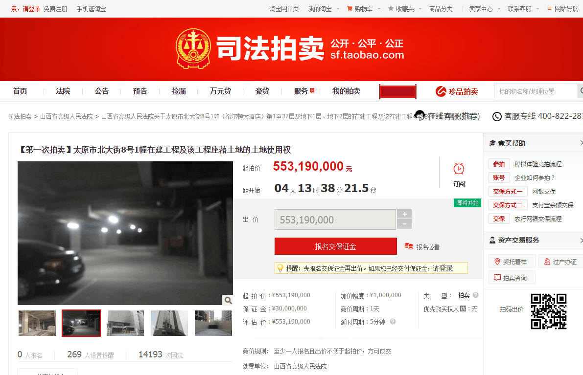 根據網頁介紹,屆時將被拍賣的是太原市北大街8號1幢山西晉豪國際大酒店有限公司開發的在建工程及該在建工程所座落土地的土地使用權。總建築面積為76139.98㎡,建築功能為酒店。網站報的起拍價55319萬元,保證金3000萬元,增價幅度100萬元(以及其整倍數)。這次拍賣行為截至目前已被1.42萬人圍觀,269人設置了拍賣提醒。
