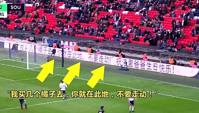 北京時間12月26日晚,2017-2018賽季英超聯賽第20輪展開角逐,熱刺主場5-2大勝南安普頓。比賽剛開場,場邊廣告牌上就出現了一排中文:“我買幾個橘子去,你就在此地不要走動!祝洛裏爸爸生日快樂!”