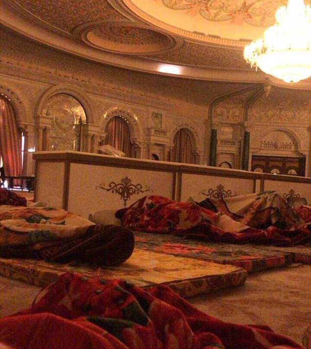 早前在當地五星級酒店中,疑似拍到王子和高官被囚禁在會議廳,被迫躺在地上睡覺。(來源:每日郵報)