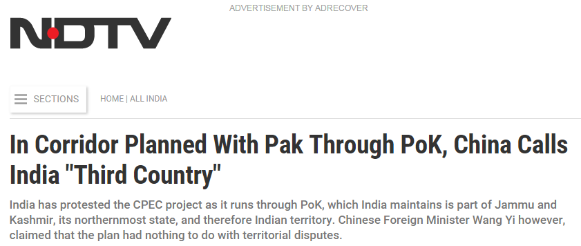 新德里電視台稱,中國同巴基斯坦商討穿過巴控克什米爾地區的中巴經濟走廊計劃,並打算延伸至阿富汗,竟然把印度稱作局外人、“第三方”,稱該計劃“不針對印度”。隨後,這家印媒在報道中搬出了27日我外交部發言人華春瑩的發言。