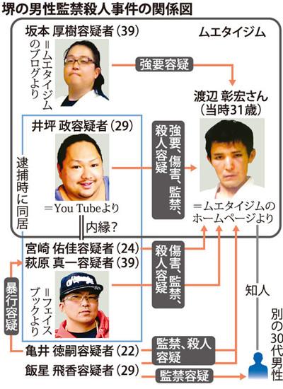 據日本《產經新聞》報道,縣警於12月將井坪政(29歲)等5名嫌疑人逮捕。另外,因涉嫌同井坪政合謀強迫渡邊彰宏飲下糞尿等髒物,堺市西區的泰拳健身房經營者坂本厚樹(39歲)也被逮捕。同井坪政共同實施監禁的另外4名嫌疑人宮崎佑佳(24歲)、萩原真一(39歲)、飯星飛香(29歲)、龜井德嗣(22歲)也因殺人嫌疑被捕。而死者同5名嫌疑人結識是在坂本厚樹位於堺市西區商業街經營的健身房。