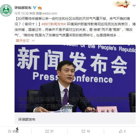 劉友賓:大家比較關心煤改氣和北方地區清潔供暖工作,環保部關於煤改氣和清潔供暖工作的態度是一貫的,就是把人民羣眾温暖過冬作為頭等重要的民生大事。對於一些地區一度出現的因天然氣短缺等問題影響羣眾取暖的情況,環保部高度重視。
