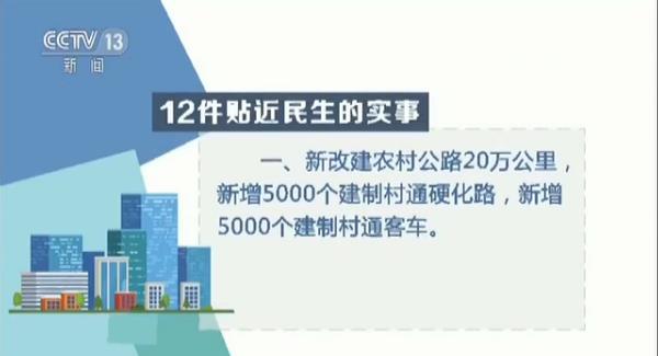 這12件更貼近民生的實事包括:一、新改建農村公路20萬公里,新增5000個建制村通硬化路,新增5000個建制村通客車;二、實施鄉道及以上公路安全生命防護工程18萬公里、危橋改造2500座;三、推進建設改造普通國省幹線公路服務設施1000個,提升普通國省幹線公路服務能力和水平;四、新增高速公路電子不停車收費系統(ETC)專用車道2000條,ETC用户1500萬,進一步發揮ETC聯網運營成效,提升收費公路服務水平;五、推進取消行政許可事項,壓縮涉企證照,全面推行行政許可網上辦理;六、推動公交都市創建,提升城市居民出行服務水平;七、推進交通“一卡通”便捷支付,進一步擴大使用人羣,擴大互聯互通應用範圍和數量;八、推進全國汽車維修電子健康檔案系統建設,提升汽車維修服務滿意度;九、推進道路普通貨運車輛異地檢驗檢測,便利貨車檢驗檢測服務;十、推進“司機之家”建設,改善貨車司機工作條件;十一、建成船員“口袋工程”,進一步完善系統功能,把服務送到船員手上,裝進船員口袋;十二、利用長江口深水航道邊坡自然水深,實現大型船舶超寬交會,提高通航效率。
