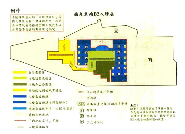 第二條 內地口岸區的範圍為西九龍站地下二、三層的劃定區域、地下四層月台區域及有關連接通道,包括內地監管查驗區、辦公備勤區、離港乘客候車區、車站月台和連接通道及電梯。內地口岸區範圍的詳情見附件。
