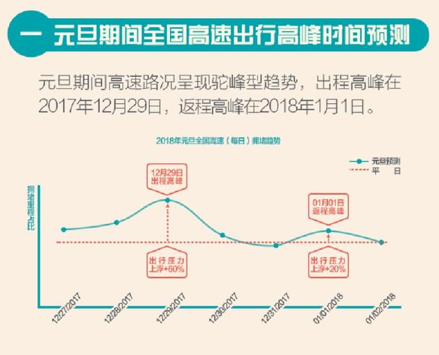 小長假期間,全國高速路況將較為平穩,預計12月30日中午11時-12時將出現一波出行小高峯。而返程高峯預計將出現在2018年1月1日15時19時,全天高速出行壓力將較平日上浮20%。