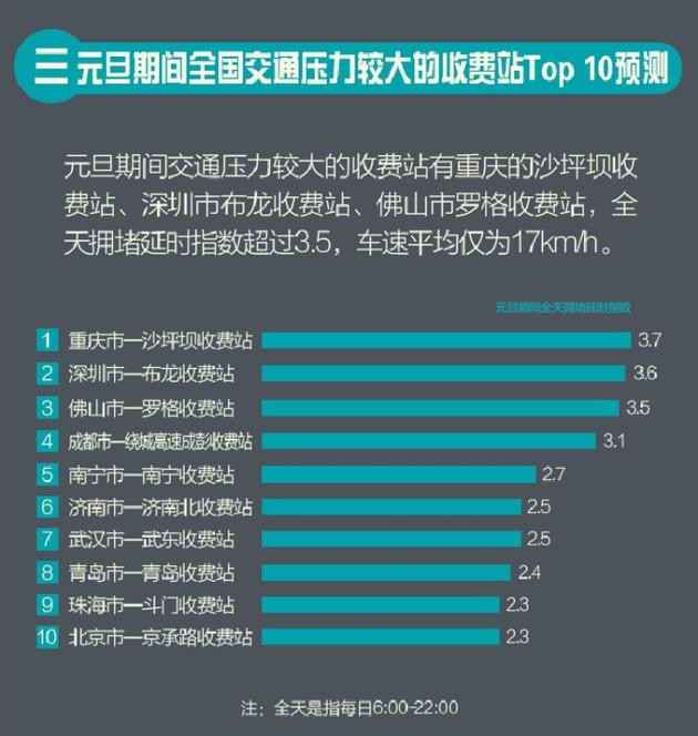 報告還對元旦期間交通壓力較大的收費站進行了預測。小長假期間,全國交通壓力較大的收費站前三位分別為重慶沙坪壩收費站、深圳布龍收費站和佛山羅格收費站,預計這三個收費站的全天擁堵延時指數均將超過3.5,車速平均為17km/h。