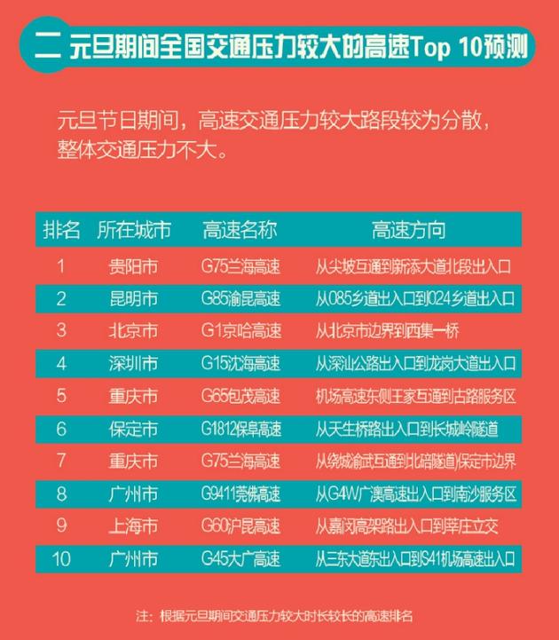 12月28日,,高德地圖聯合全國80多家交通管理部門發佈《2018元旦出行熱點預測報告》。該報告依據歷年元旦小長假前後的高德地圖交通大數據,融合全國80多個省、市交管部門的數據與高德地圖位置大數據和POI大數據,分析了2018年元旦期間全國交通壓力趨勢及出行趨勢。