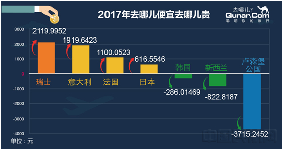 報告顯示,2017年出境機票貴了,平均每張國際機票同比貴243.3元。出境去希臘、瑞士、意大利等熱門歐洲國家,平均每張單程機票比去年貴2000元左右。