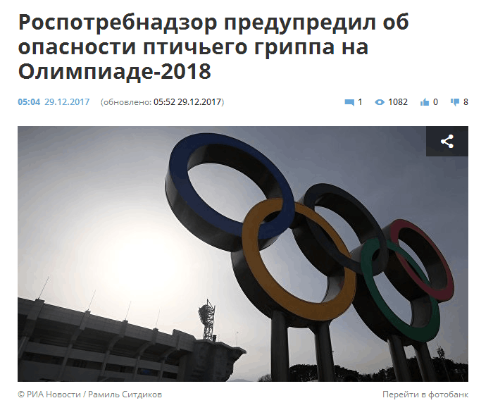 俄聯邦消費者權益及公民平安保護監督局建議所有計劃前往韓國參加2018年平昌冬奧會的運動員及遊客,接種預防季節性流感的疫苗,不要前往禽類養殖場,避免與家禽和野生禽類接觸,不要食用未經過高温加工的禽類產品,並經常使用肥皂洗手。