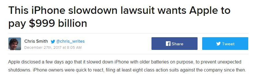 蘋果“電池門”事件讓全世界廣大的使用者感到相當不滿,許多媒體也認為蘋果的處理的方式確實不恰當,許多果粉“信心受創”也展開提告。