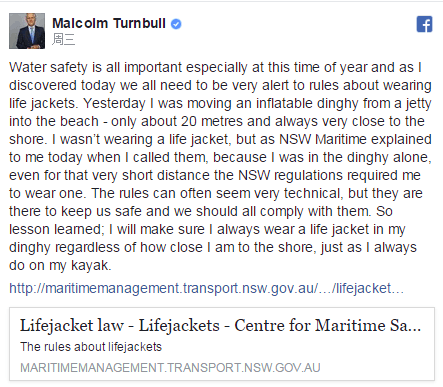 【環球網綜合報道】新加坡《聯合早報》12月30日報道稱,澳大利亞總理特恩布爾於當地時間27日被拍到乘坐充氣艇出海時沒有穿救生衣,因違反當地法律,被罰款250澳元(約合1271元人民幣)。