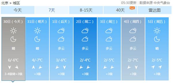 明後天,北京天氣將以晴到多雲為主,最高氣温逐步下滑,1日最高氣温將僅為3℃,天氣寒冷,公眾外出需注意防寒保暖。