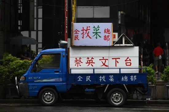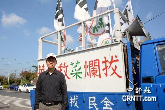盧朝財開着“全民拔菜總部”宣傳車來台南參加紀念抗日事件的追思活動。(圖源:中評社)