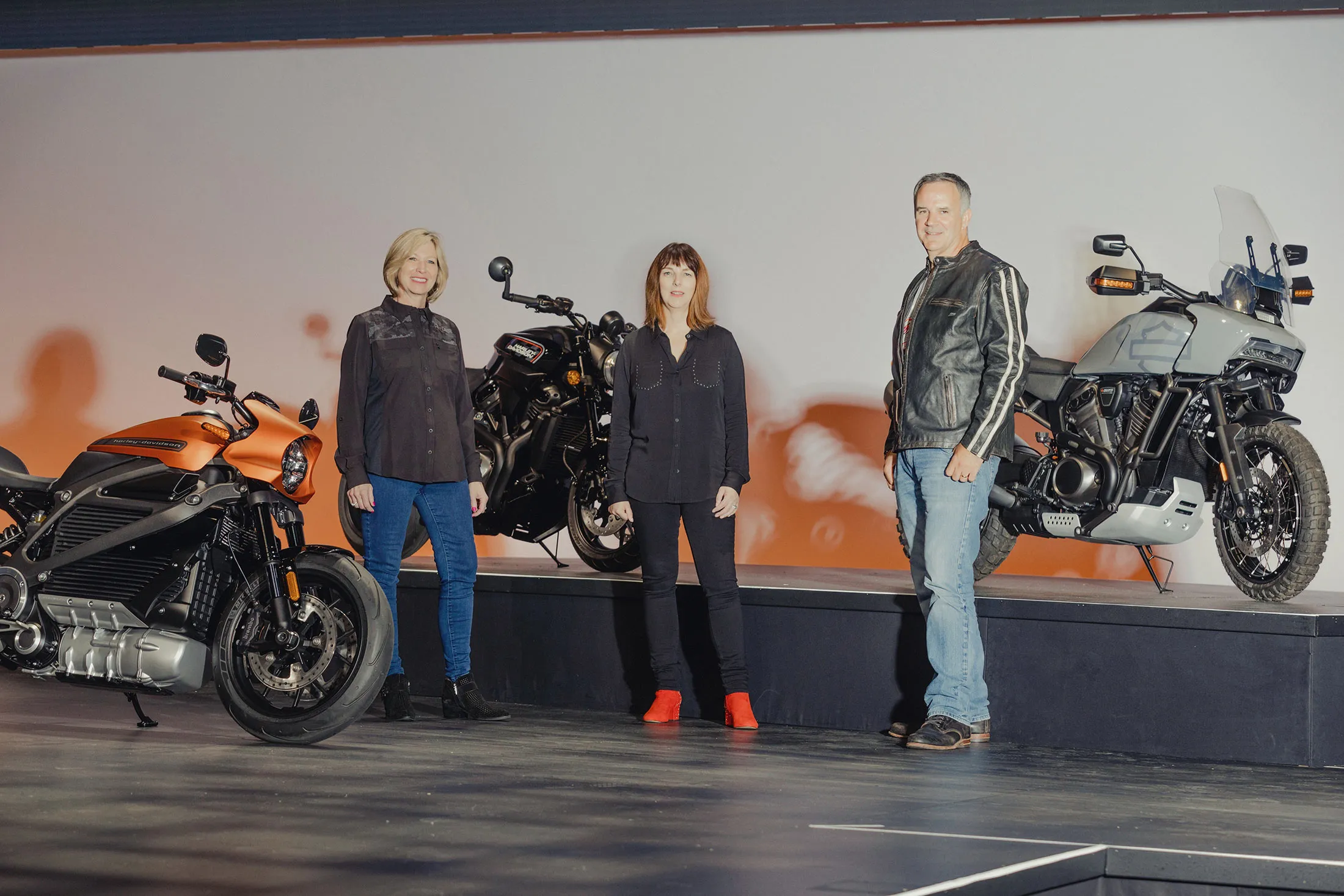 左起:哈雷-戴維森的米歇爾·庫姆比爾、海瑟·馬倫謝克和馬修·萊瓦蒂奇站在LiveWire(左)、街頭戰士和泛美冒險摩托車前。攝影師:朱利安·伯曼,彭博商業週刊這種直覺導致了一些尷尬的疏忽。2011年,哈雷的頂級工程師和高管們在亞利桑那州的測試賽道上試驗新版本的豪華旅行摩托車——這些摩托車是為長途旅行設計的——當有人提到夫妻騎乘70%的旅行摩托車時,時任首席運營官的萊瓦蒂奇聽到後臉色蒼白。他和工程師們都沒有考慮到乘客,乘客通常還是男性騎士的妻子或女友。庫姆比爾是現場唯一的女性。“她是唯一一個曾經做過乘客的人,”萊瓦蒂奇説。“我們意識到我們在設計一款產品,但只聽取了一半客户的意見。”