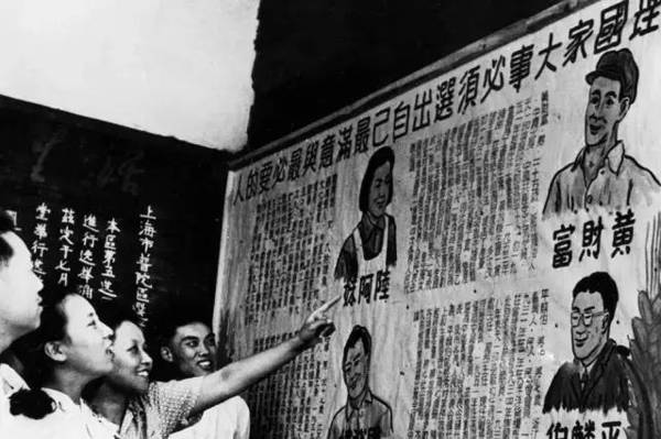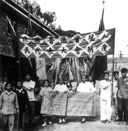 一九五三年三月一日,中央人民政府公佈實施選舉法。圖為北京市民迎接新中國第一次普選。