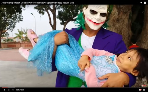 這類影片大多翻拍自 YouTube 上的迪士尼歡樂蜘蛛俠系列視頻,通常以艾莎公主、蜘蛛俠、小丑等小朋友熟悉的迪士尼人物為主角,真人出演劇情荒誕,加入暴力、色情和低級笑料,沒有什麼不敢幹。