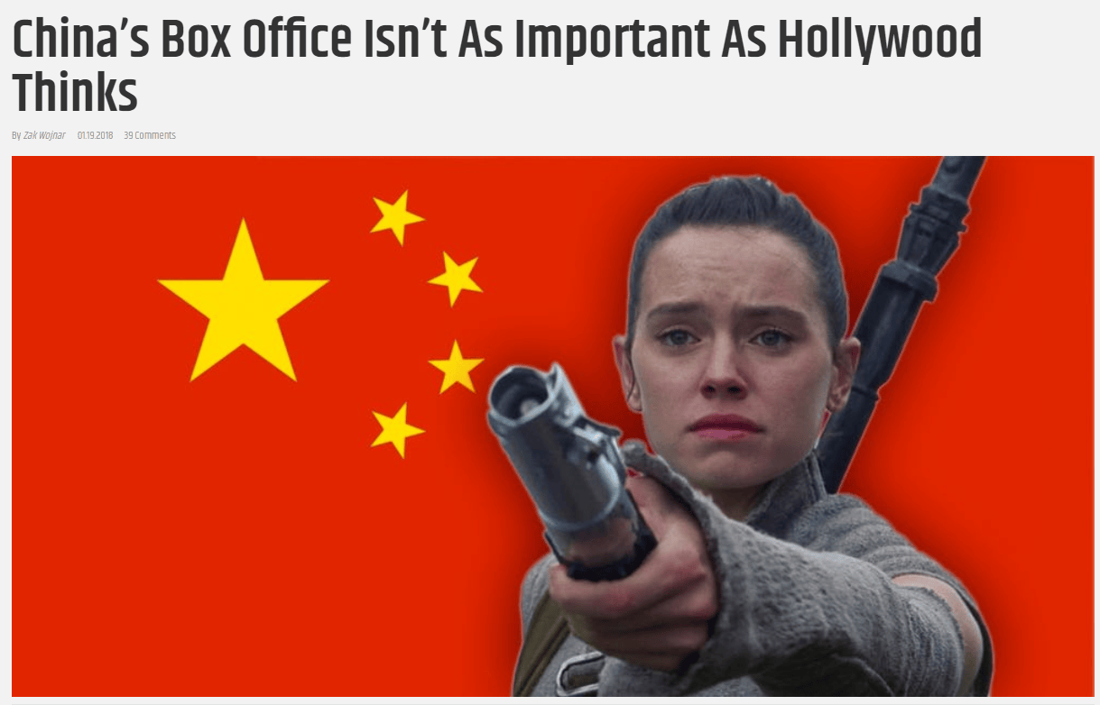 Screen Rant稱,**世界上第二大票房市場是中國 -——但是好萊塢是不是被錢矇蔽了雙眼以至於看不清現實?**這個國家對全球票房數量的重要性有很大的影響,而最近“星球大戰:最後的絕地武士”在中國徹底失敗成為頭條新聞。這個IP巨頭在全球狂收12.7億美元,然而在中國預計票房將在5千萬美元以下,比上一部“原力覺醒”(The Force Awakens)的1.24億美元的票房更少,大家都覺得這簡直不可思議。