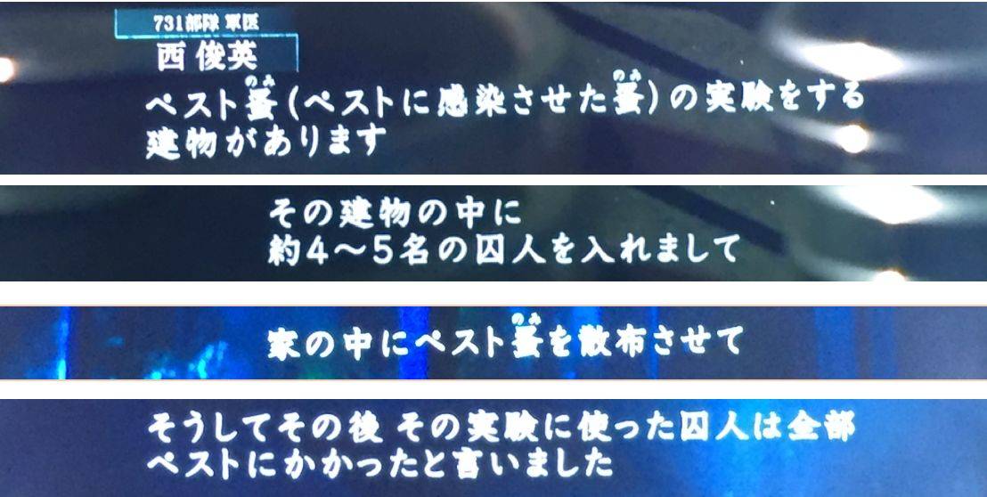 原軍醫西俊英證實説,當時731部隊駐地有專門進行鼠疫實驗的場所,把4至5名囚犯關進房間,散佈鼠疫病菌讓他們全部感染。