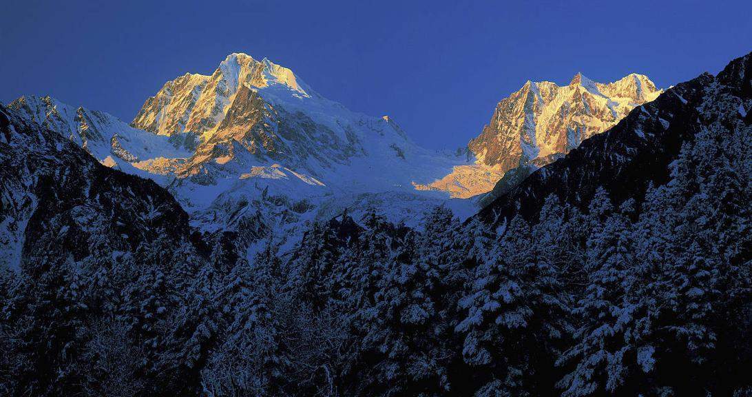 四姑娘山,在晴天成都都可以看見,從右到左的四座山峯,分別叫大姑娘,二姑娘,三姑娘,最高的那個被四川人用稱呼女子的愛稱命名為幺妹峯。最矮的大姑娘也是5300米,高過歐洲最高峯勃朗峯。每天日出日落日照金山美不勝收。