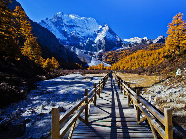 這樣的風景照片足以震動朋友圈。跟世界聞名的加拿大班夫國家公園比,一樣 都是冰湖森林雪山,可以説各有千秋,畢棚溝的湖泊和峽谷的面積稍微小一些,但是湖水高寒藻類不多更清澈,山脈比班夫公園要矮一些不是那麼的雄偉,但因為海拔落差高各種植被顏色層次明顯。