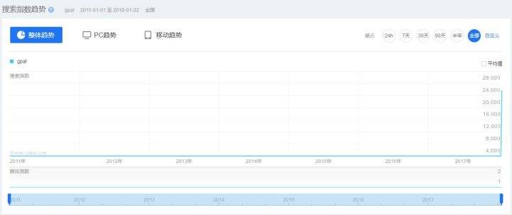 我隨手搜了下 GPAL 的搜索指數,發現這個詞從 2011 年到 2018 年這 7 年,指數數值都是 0,直到 2018 年 1 月才突然爆表: