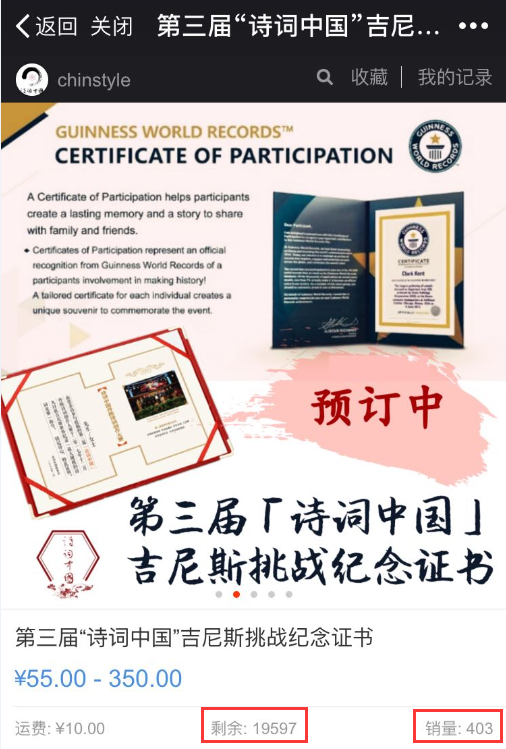“詩詞中國”售賣的為“第三屆‘詩詞中國’吉尼斯挑戰紀念證書”。
