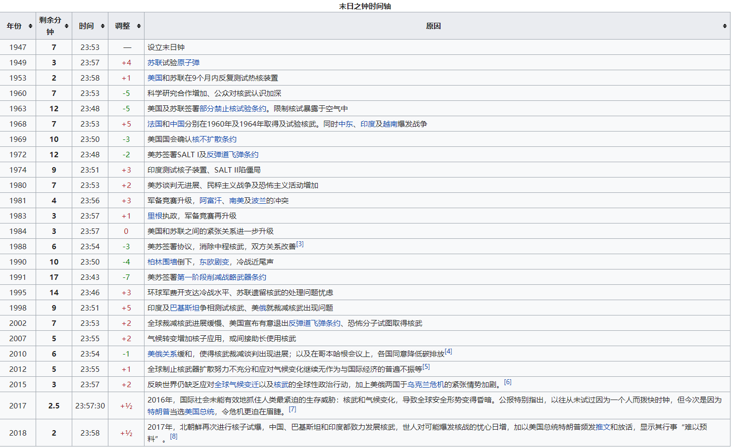 最後附上自1947年設置“末日時鐘”以來,不同時期的增減情況及原因。