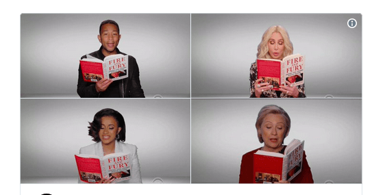 捧着暢銷書《火與怒:揭秘白宮內幕》的美國歌手約翰·傳奇、女演員雪兒、饒舌歌手Snoop Dogg、Cardi、DJ卡利輪番出場,開始朗讀書中的內容。
