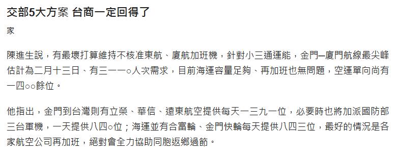 兩岸春運主要加班航班是東航與廈航,共計176個航班,運輸旅客約5萬人,讓這五萬人乘坐其他航班前往台灣。暫且不説由此產生的額外機票費用與額外消耗的時間,在春運航班高峯期間,想臨時買別的機票有那麼容易麼?而詳細的方案更是腦洞奇大。
