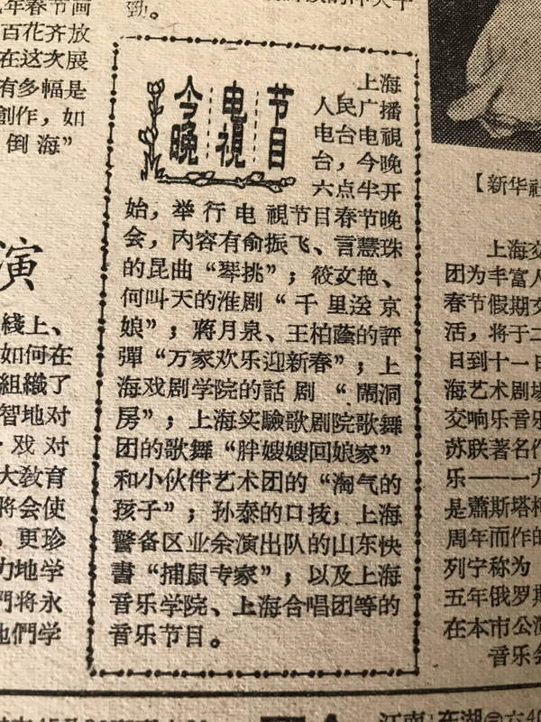 1959年2月7日上海電視台節目單(部分)這一年2月6日的《文匯報》和7日的《新民晚報》也刊登了除夕上海電視台的節目預告,以此可作佐證。