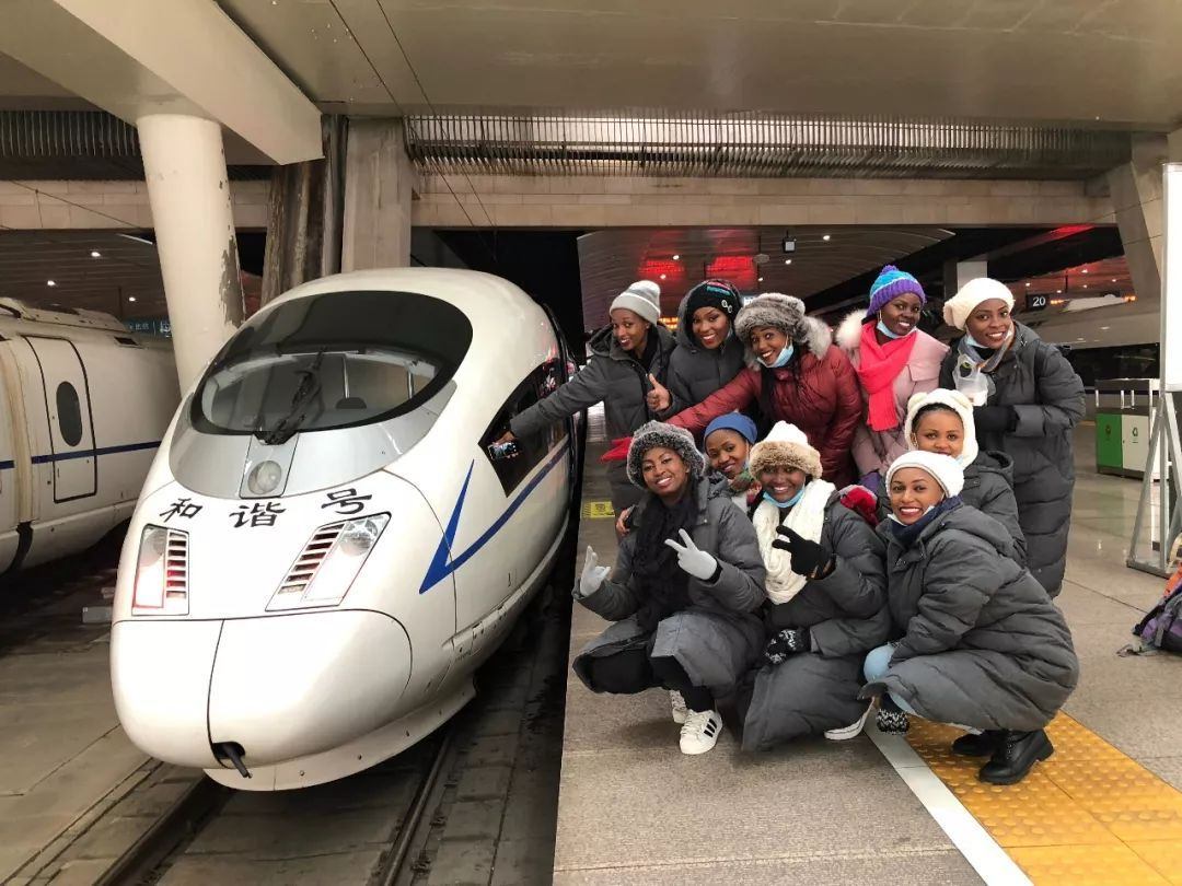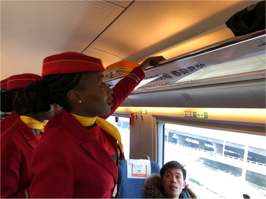 2月8日,這10名肯尼亞女乘務員在排練之餘乘坐往返北京和天津的和諧號動車,並在天津客運段列車長王祝君的帶領下學習中國“動姐”的作業標準和服務技巧。
