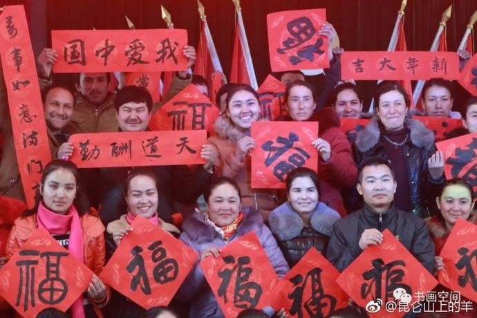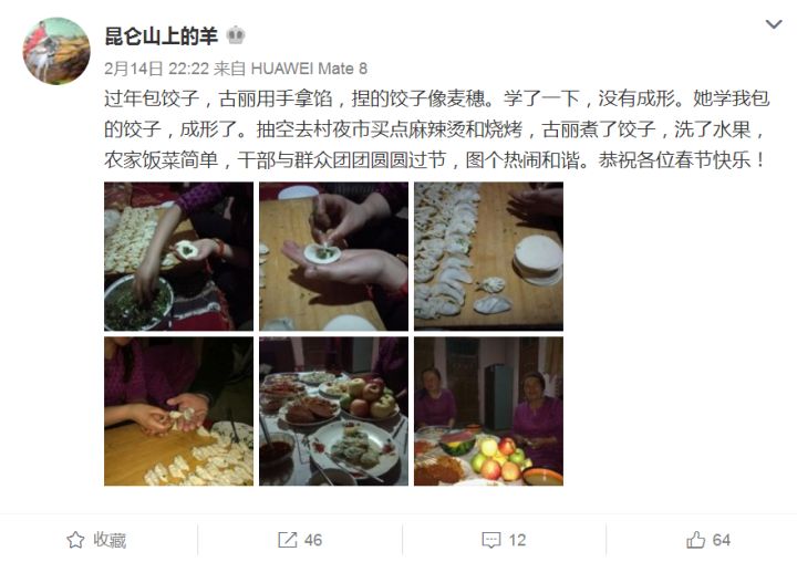 他們和南疆維吾爾族老鄉過春節的照片,我沒能及時要到,但我剛在微博上,看到博主@崑崙山上的羊 貼了幾張照片,我決定拿過來借用一下。