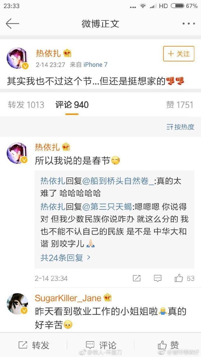 熱依扎是個公眾人物,發的微博自然也會有很多人關注,她説自己“其實也不過這個節”,網友以為他説的是情人節,她又進一步解釋“所以我説的是春節”。