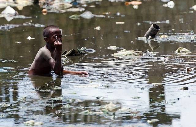 即使在這樣的河水裏,仍有小男孩在玩耍。但攝影師的鏡頭對準他時,他玩笑的豎起了中指。