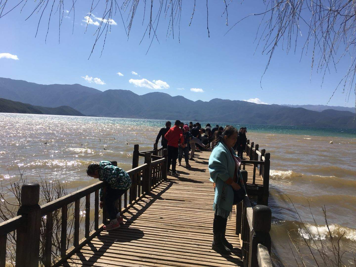 我離開瀘沽湖,開往麗江。再遠去的山路上回頭看瀘沽湖全景,宛如天堂。沿湖開車,各處風景不同。湖水遠看如地獄般手中間是綠色近岸是黃色。湖風徐徐啊,湖水一浪一浪的推向岸邊。