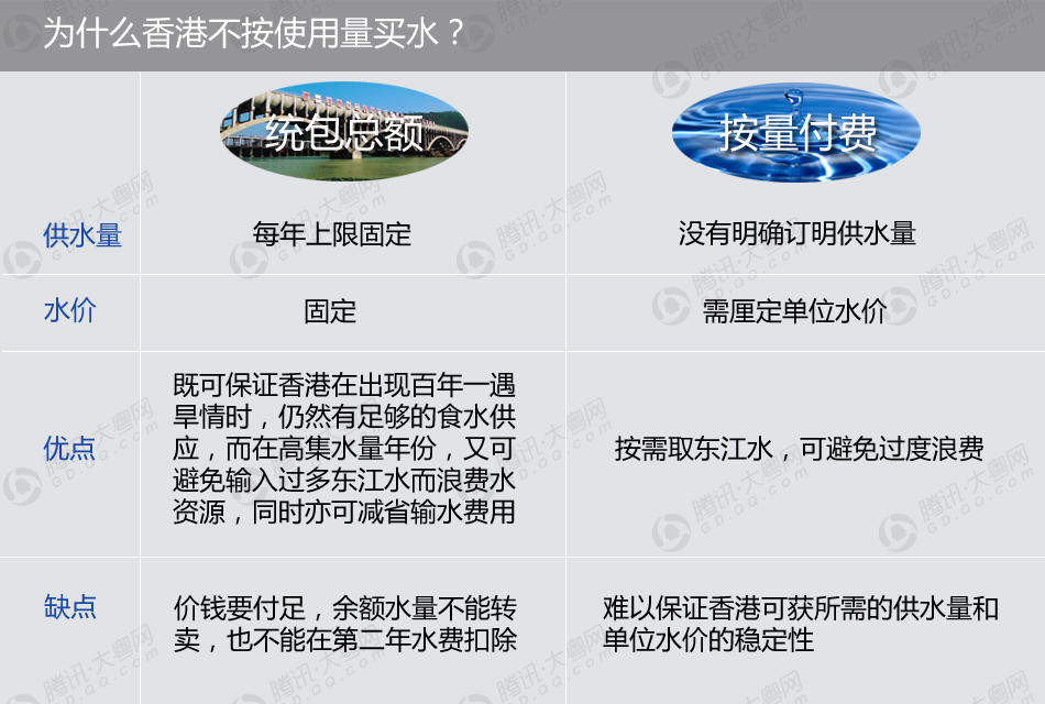 香港購買廣東東江水資源採用“統包總額方式”,以確保即使在百年一遇的極端乾旱情況下,也會可靠和靈活地獲供應東江水,以應付香港實際需要。那麼,怎麼理解協議中的這種“購買方式”呢?《南方都市報》曾在報道中解釋道,現行協議採取的“統包總額方式”,即每年供水量上限及水價固定,若然該年雨量多,便可無須用足東江水供水量上限,但價錢卻要付足,沒用盡的餘額水量不能轉賣,也不能在第二年水費扣除。對於為何不採用按量付費的方式,2014年11月12日,發展局局長陳茂波的書面答覆是,在與粵方磋商未來3年的新供水協議期間,曾與粵方探討採用“按量付費”方式的建議。由於這方式不會訂明每年供水量,而深圳及廣東省部分城市對東江水需求殷切,因此粵方認為難以保證香港可獲所需的供水量。特別是在旱年,由於香港與廣東省有同樣的氣候環境(包括降雨量模式、温度等),本地集水量與可供分配的東江水量或會一同縮減,粵方或無法因應本港要求提供足夠的東江水量,影響香港的供水安全。此外,如採用“按量付費”方式,需釐定單位水價。由於沒有明確訂明供水量,在釐定單位水價時,粵方可能會加入實際供水量不確定的因素,以確保有合理收入作運作開支及相關投資回報。因此,在“按量付費”方式下,當香港在旱年需要增加輸入東江水量時,所支付的款額可能較按現行“統包總額”方式為高。