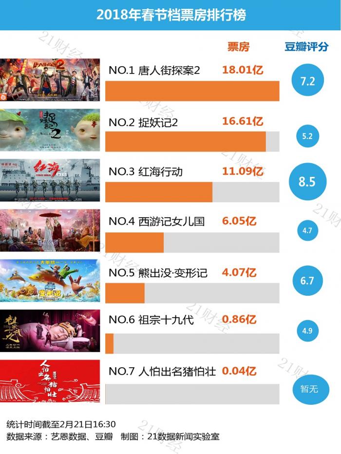 目前,春節檔上映的影片中,《唐人街探案2》票房最高,《紅海行動》的評價最高。