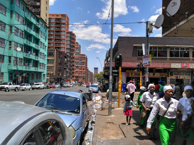 約翰內斯堡CBD,摩登的天際線下有一種沒落的氣息。公園車站(Park Station)一帶喧囂的批發街市和路邊攤有點像廣州一德路、武漢漢正街,只是遠沒有那麼繁忙。希爾布羅這個曾經搖滾、同性戀酒吧星羅棋佈的高檔白人公寓區,則被來自周邊國家的黑人新移民佔據。CBD如今只是個地名,真正的中央商務區和白人中產社區,早已外遷到了北郊的桑頓、蘭德堡和羅斯班克等地。