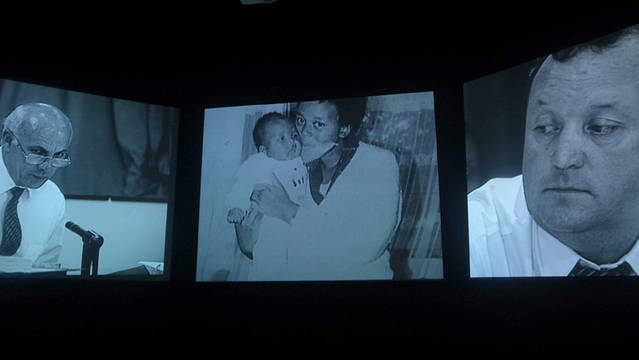 種族隔離博物館內的TRC三屏影像,從左到右:法官、受害者、加害者。
