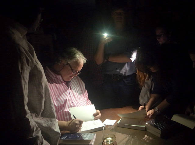 雅克·鮑在《總統的管家》發佈會停電中斷後,繼續給讀者簽名。