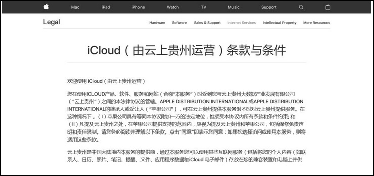 因此,只能由“雲上貴州”和中國用户簽訂iCloud的條款與條件。該法律文件中第二段明確説明:“您在使用ICLOUD產品、軟件、服務和網站(合稱“本服務”)時受到您與雲上貴州大數據產業發展有限公司(“雲上貴州”)之間的本法律協議的管轄。”(見下圖)