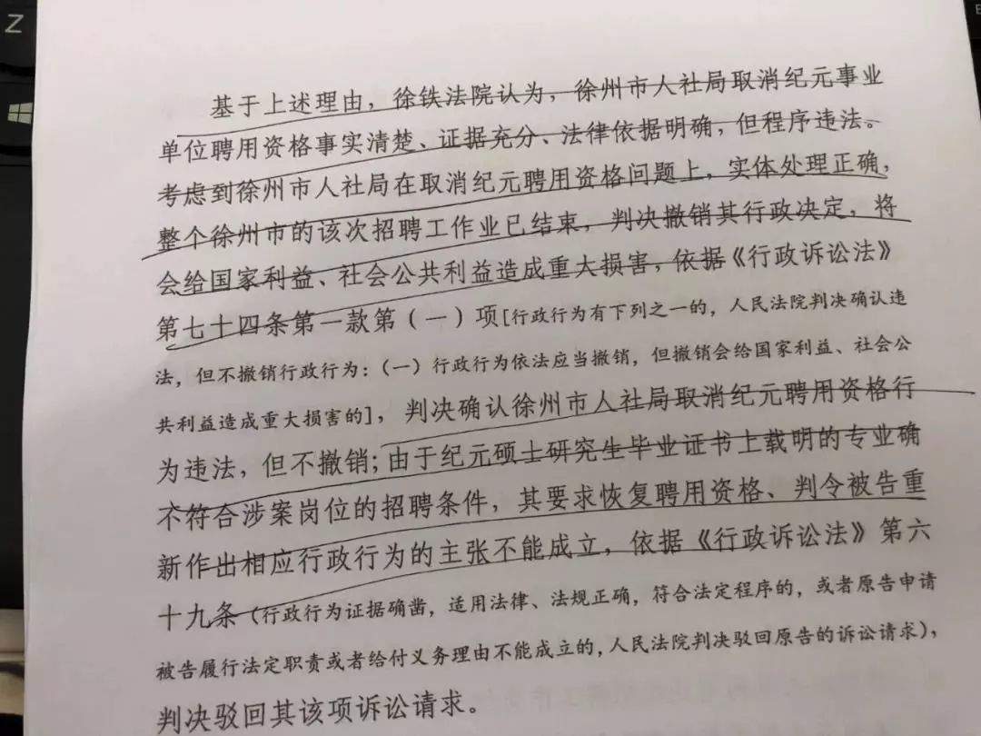 並且,一審法院徐州鐵路運輸法院作出的“拒錄實體正當”但“程序違法”這一判決,也讓人質疑。特別是判決書中載明,“判決撤銷人社局行政決定,將會給國家利益、社會公共利益造成重大損害”,更讓人百思不得其解。