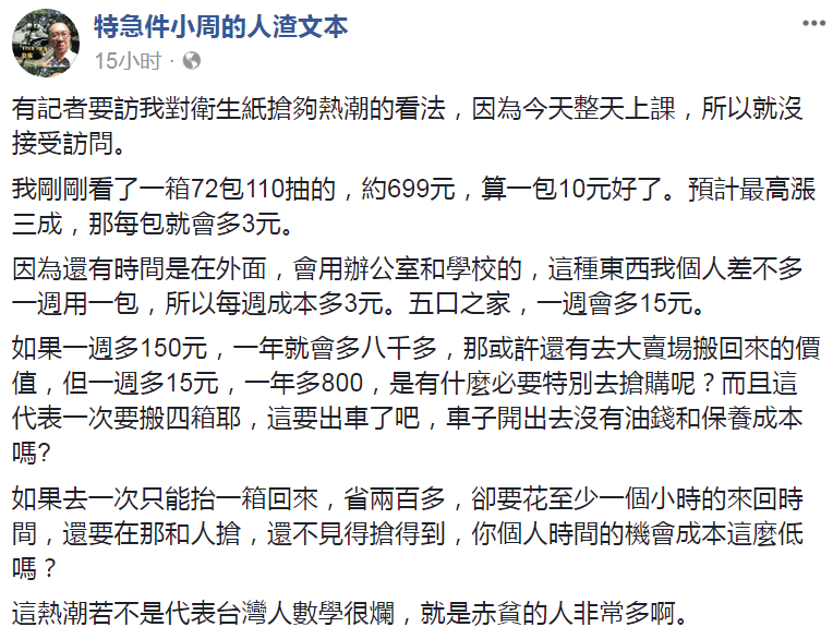 27日晚,台灣作家、輔仁大學助理教授周偉航在臉書就此事評論:一箱72包110抽的,約699元(新台幣,下同),算一包10元好了。預計最高漲三成,那每包就會多3元……何必要特別去搶購,開車出去載沒有油錢與保養成本嗎,“這熱潮若不是代表台灣人數學很爛,就是赤貧的人非常多啊。”