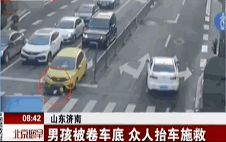 山東濟南街頭,一個小男孩過馬路時不幸被捲入車底。