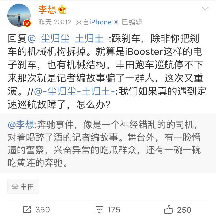 汽車之家創始人@李想 直言奔馳事件像是一個神經錯亂的司機,對着喝醉了酒的記者編故事。