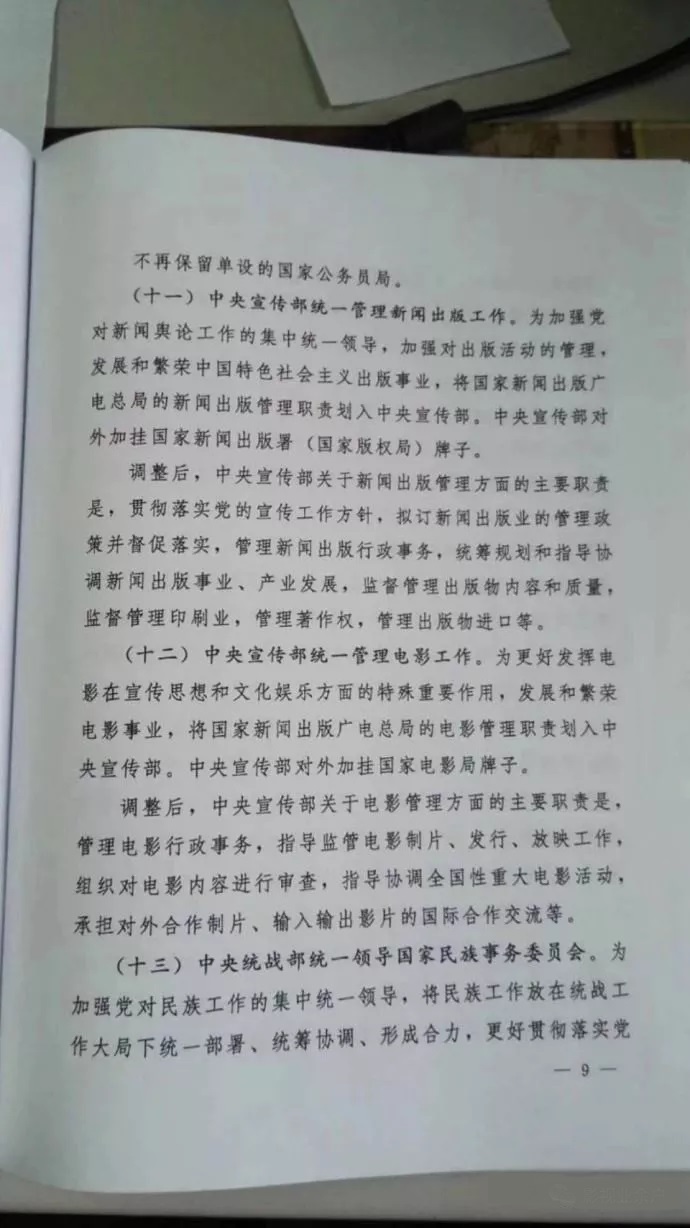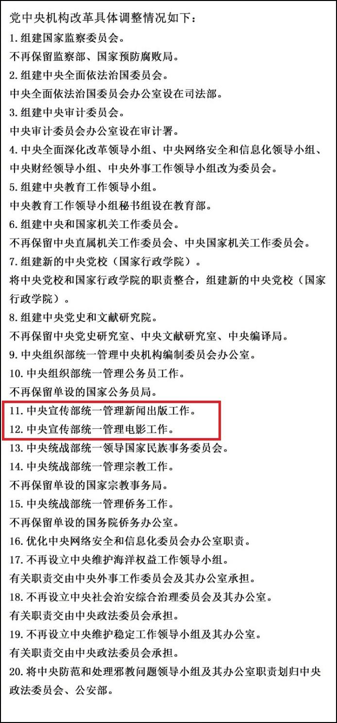 稍晚時分,新華社21日報道,中共中央日前印發了《深化黨和國家機構改革方案》,併發出通知,要求各地區各部門結合實際認真貫徹執行。其中提到中央宣傳部統一管理新聞出版和電影工作。