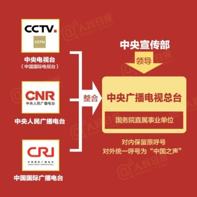 組建中央廣播電視總枱。堅持正確輿論導向,高度重視傳播手段建設和創新,提高新聞輿論傳播力、引導力、影響力、公信力,是牢牢掌握意識形態工作領導權的重要抓手。為加強黨對重要輿論陣地的集中建設和管理,增強廣播電視媒體整體實力和競爭力,推動廣播電視媒體、新興媒體融合發展,加快國際傳播能力建設,整合中央電視台(中國國際電視台)、中央人民廣播電台、中國國際廣播電台,組建中央廣播電視總枱,作為國務院直屬事業單位,歸口中央宣傳部領導。