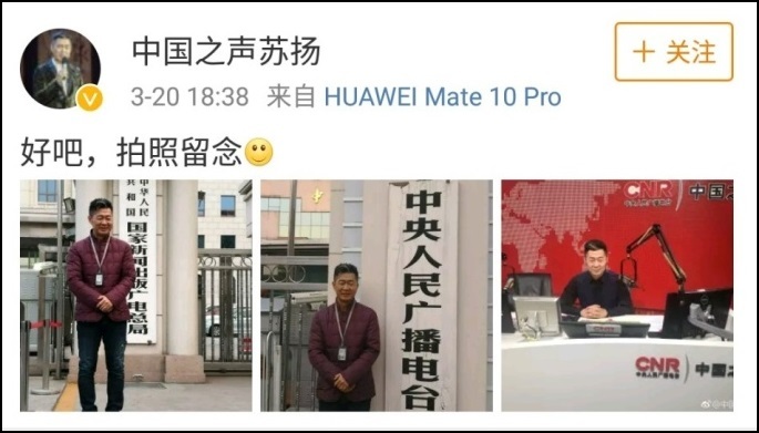 而在昨天、今天,也有多位主持人在自己單位門牌前拍照留念了,包括央廣《中國之聲》主持人蘇揚、文藝之聲主持人小曾等。