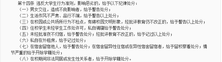 條例對“違反大學生行為準則”有八條規定,其中“男女交往,造成不良影響者”、私調寢室、夜不歸宿、在宿舍容留他人住宿給予警告處分;校園或公共場所行為不檢點,有礙校園文明形象,經批評教育仍不改正的,給予警告以上處分;在宿舍留異性住宿或在異性宿舍留宿者,給予留校察看處分;情節嚴重的給予開除學籍處分;在校期間非法同居或發生性關係者,給予開除學籍處分。